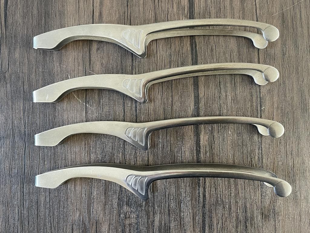 - とても良く切れて気持ちがいいです。ハンドルもつなぎ目がないので衛生面もばっちりです。あと、ハンドルの片側にでっぱりがあって、テーブルに置いた時に刃が持ち上がるので置き場所にも困りません。